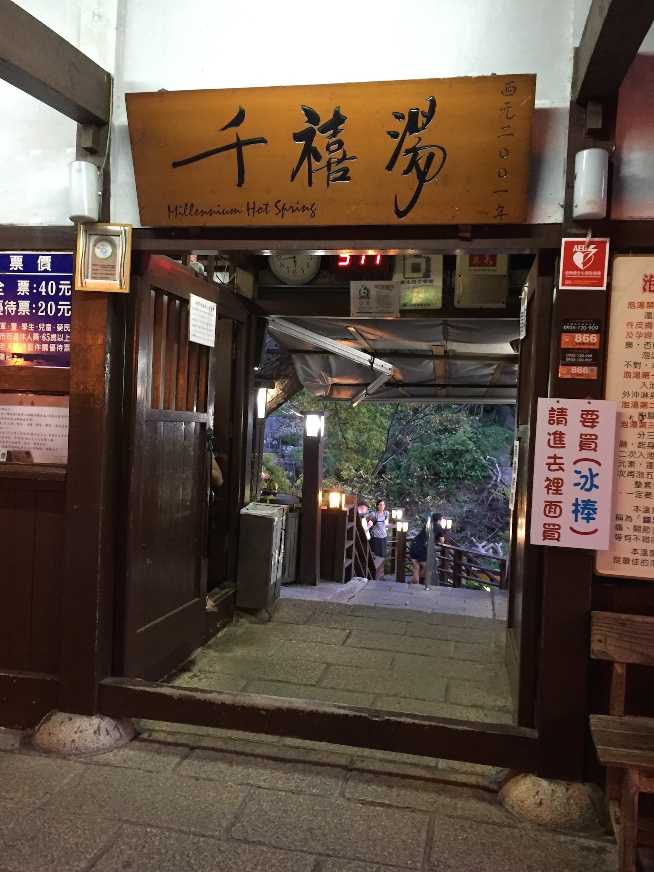 千禧湯」という公衆浴場。水着着用で入る、男女混浴の露天風呂だ。38度くらいから44,5度まで温度別に湯船が4つあり、泉質はかなり濃い。入浴料は40元(台湾ドル)と安い。地元客と観光客でかなりごった返していて、着替えするのもかなり手間取るが、そんな思いをしても、入る価値はある。