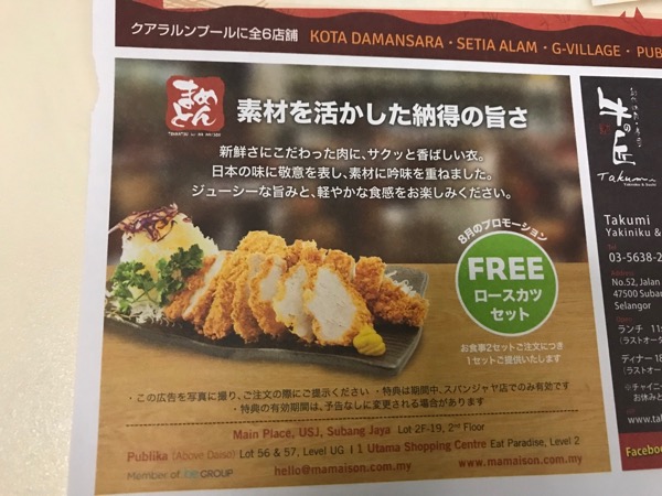 まめとんのUSJ店が、8月のプロモーションをやっている。この写真を注文時に見せると、「お食事2セットご注文につき、1セット(ロースカツセット)ご提供いたします」と、情報誌に出ていたのだ。