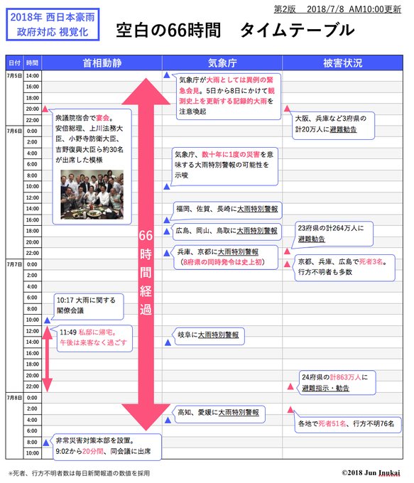 ネット上では、安倍内閣が災害対応に遅れた空白の66時間が話題になっている。非常対策本部を設置したのが、災害発生から何と3日も経った後だった。被害がどんどん酷くなり死者も増えていく中で、政府は手をこまねいていた。アベなどは、私邸に閉じこもっている始末。対応を早く行っていれば、どれだけの人の命が救われただろう。