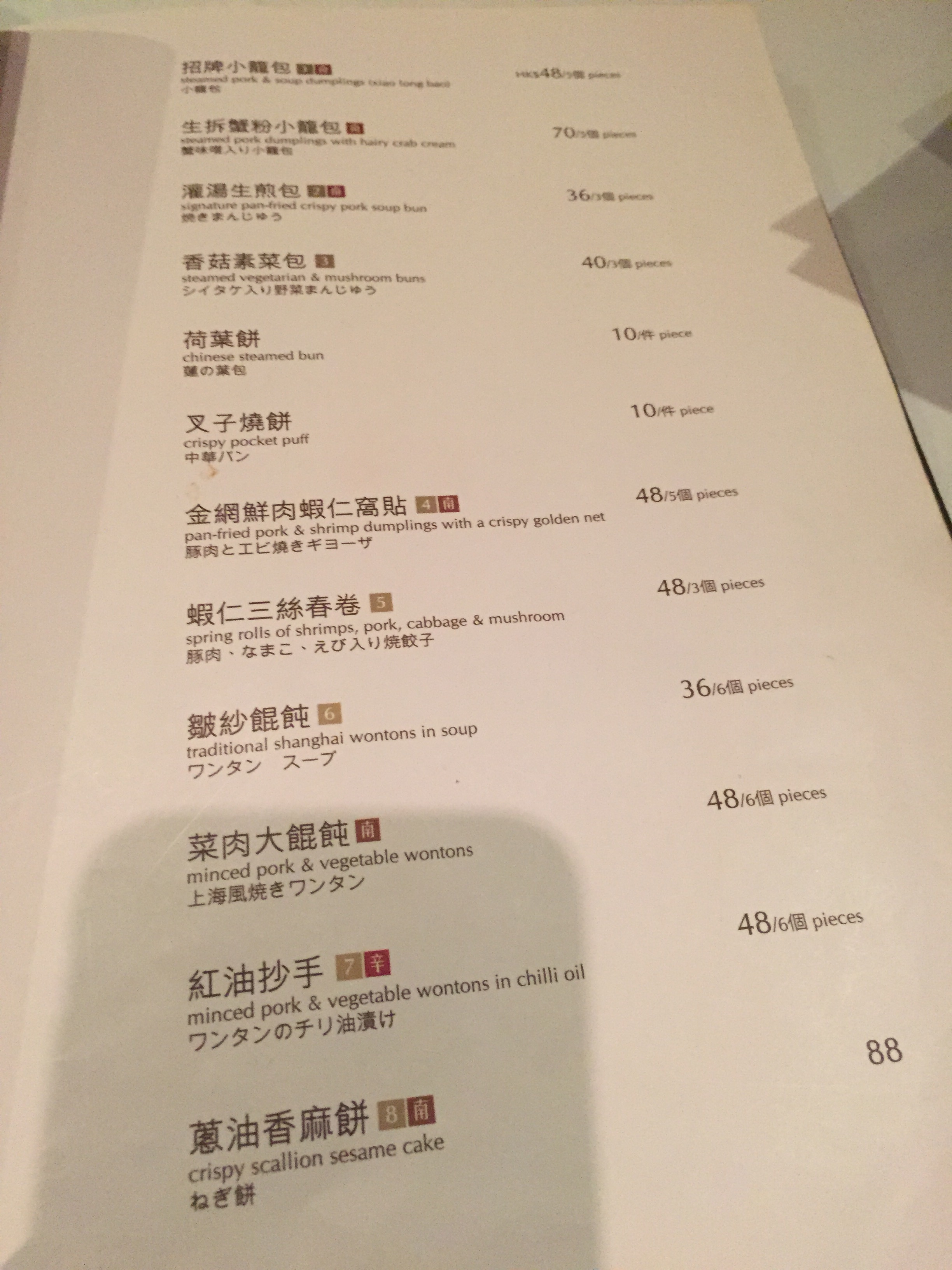 小籠包が5個入り48HKD。おいしいが、KLで食べるのものと大差ない感じ。他に上海風焼きワンタン(6個入り48HKD)などを注文。