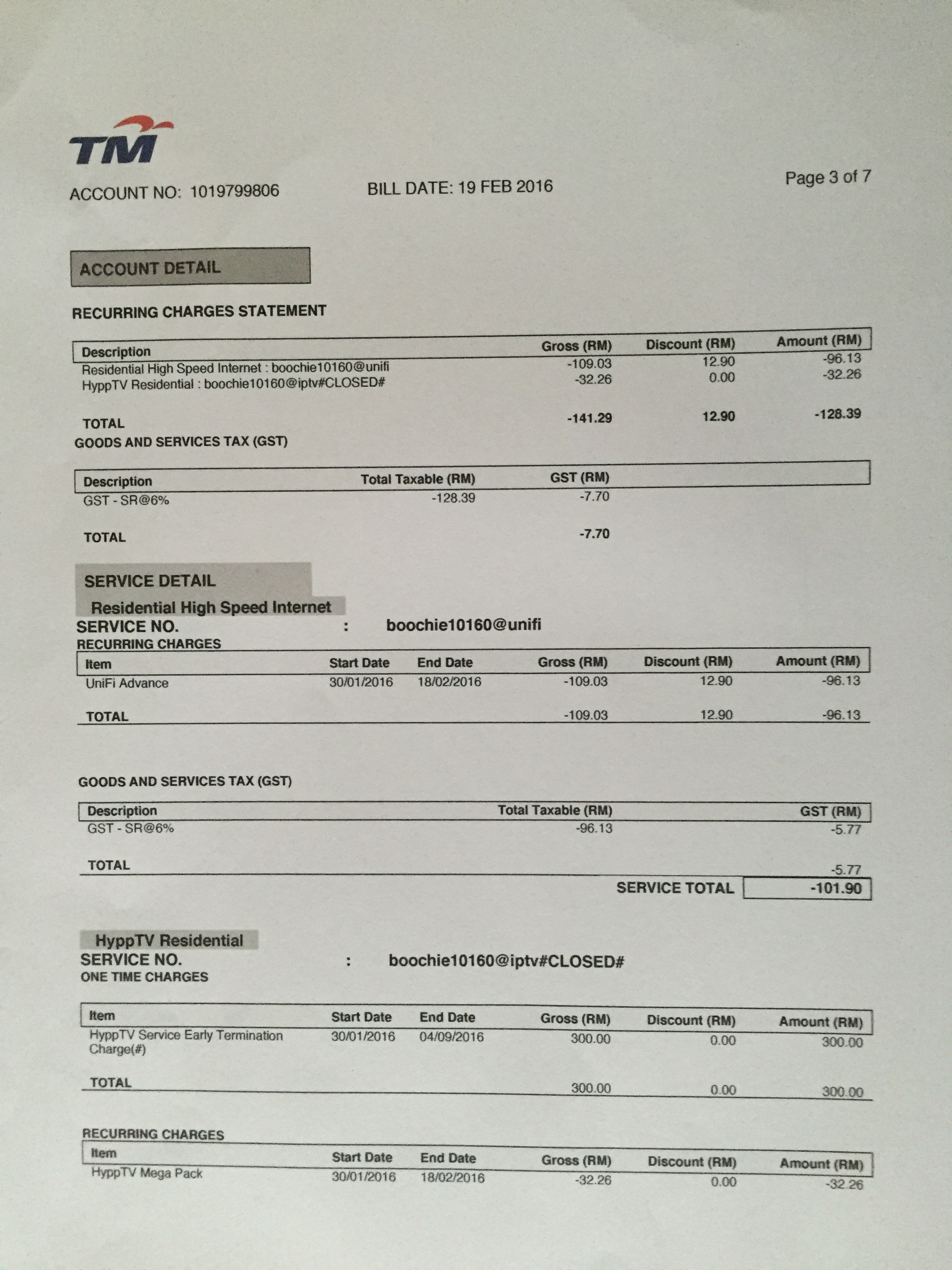 果たして届いた請求書は、あにはからんや、Happy TV Early Termination(途中解約)の300RMがプラスされた、恐ろしいものだった。どこのバカが、解約を申し出た日に新しい契約をスタートするというのだろう。そもそもUnifiとは2年以上契約しているのだから、契約解除料はかかるはずがないのだ。