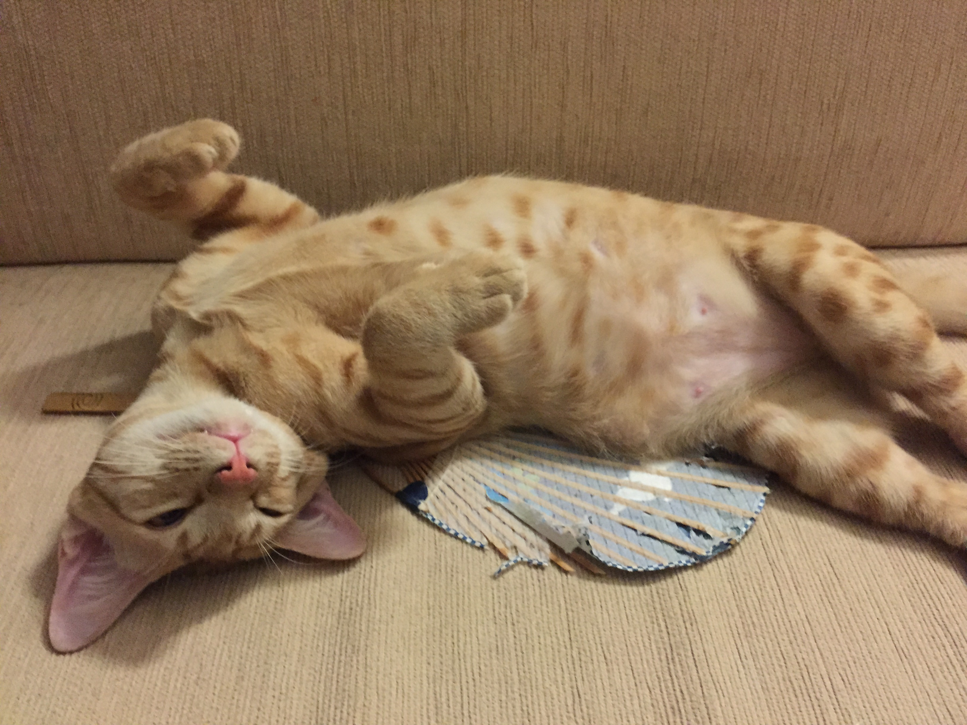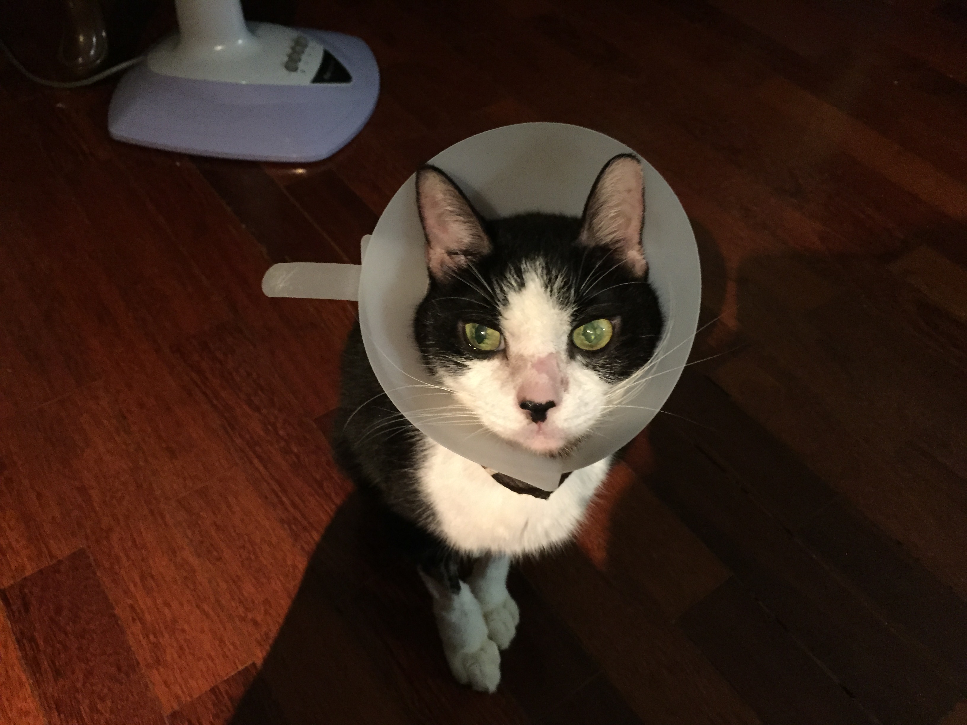 一方で、ぼっちは自分の口でフードを食べるようになったため、もうかなり回復してきた。そのため、首に巻いた包帯がうっとおしくて仕方がないらしい。引っかいて1日に何度も外してしまうため、最近はハンカチを巻いて縛って止めている。それでも取ってしまうため、とうとうエリザベスカラーを装着することに。