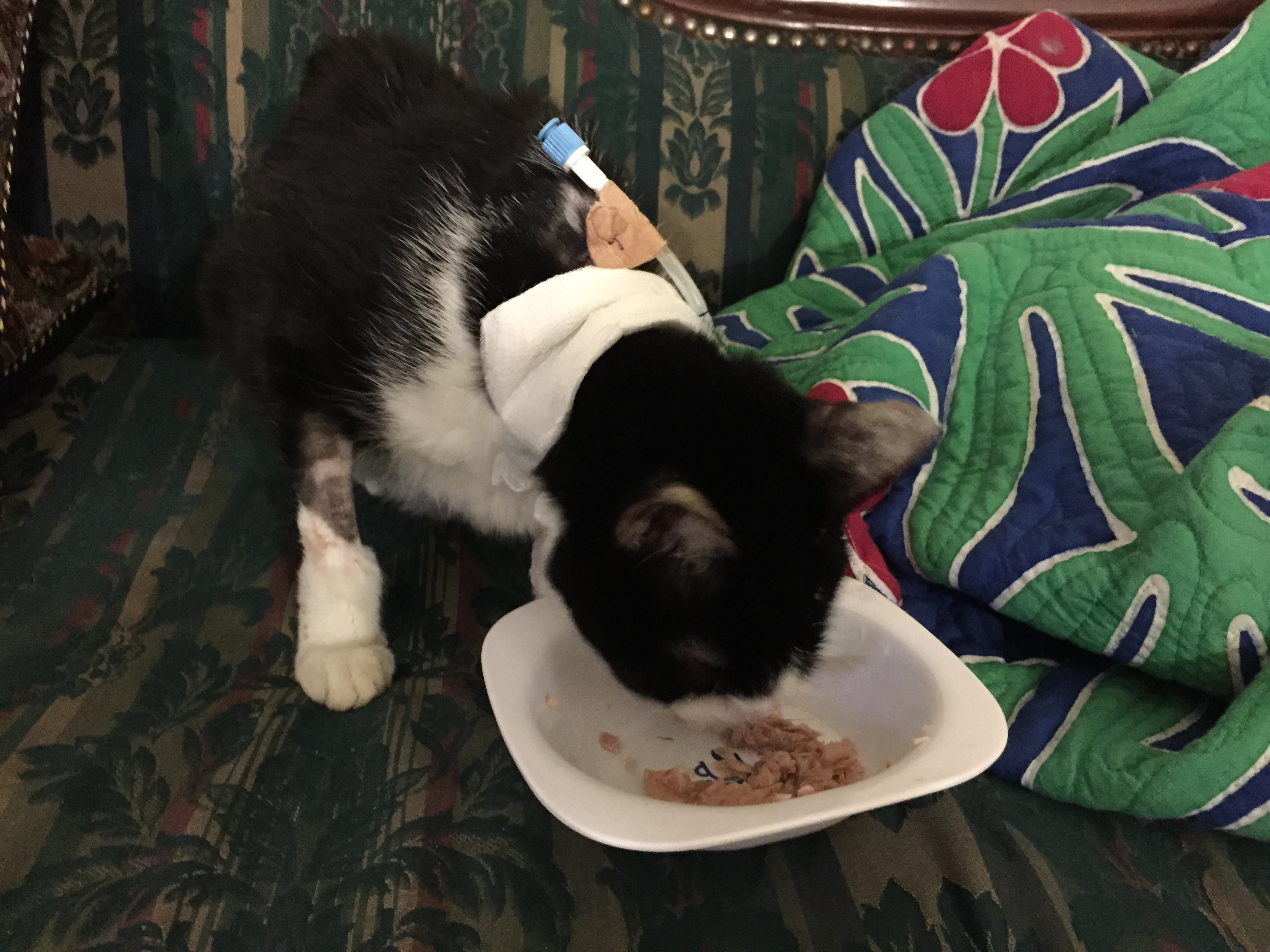 ぼっちがどんどん痩せていくのは見るに忍びなかったので、こちらとしては藁にもすがる思いで承諾した。これが功を奏したようだ。病院での期間と退院してからの期間、合計5日間ほど、この方法で食事を与えた。すると、みるみるうちに回復し、とうとう自分でフードを食べるようになった。
