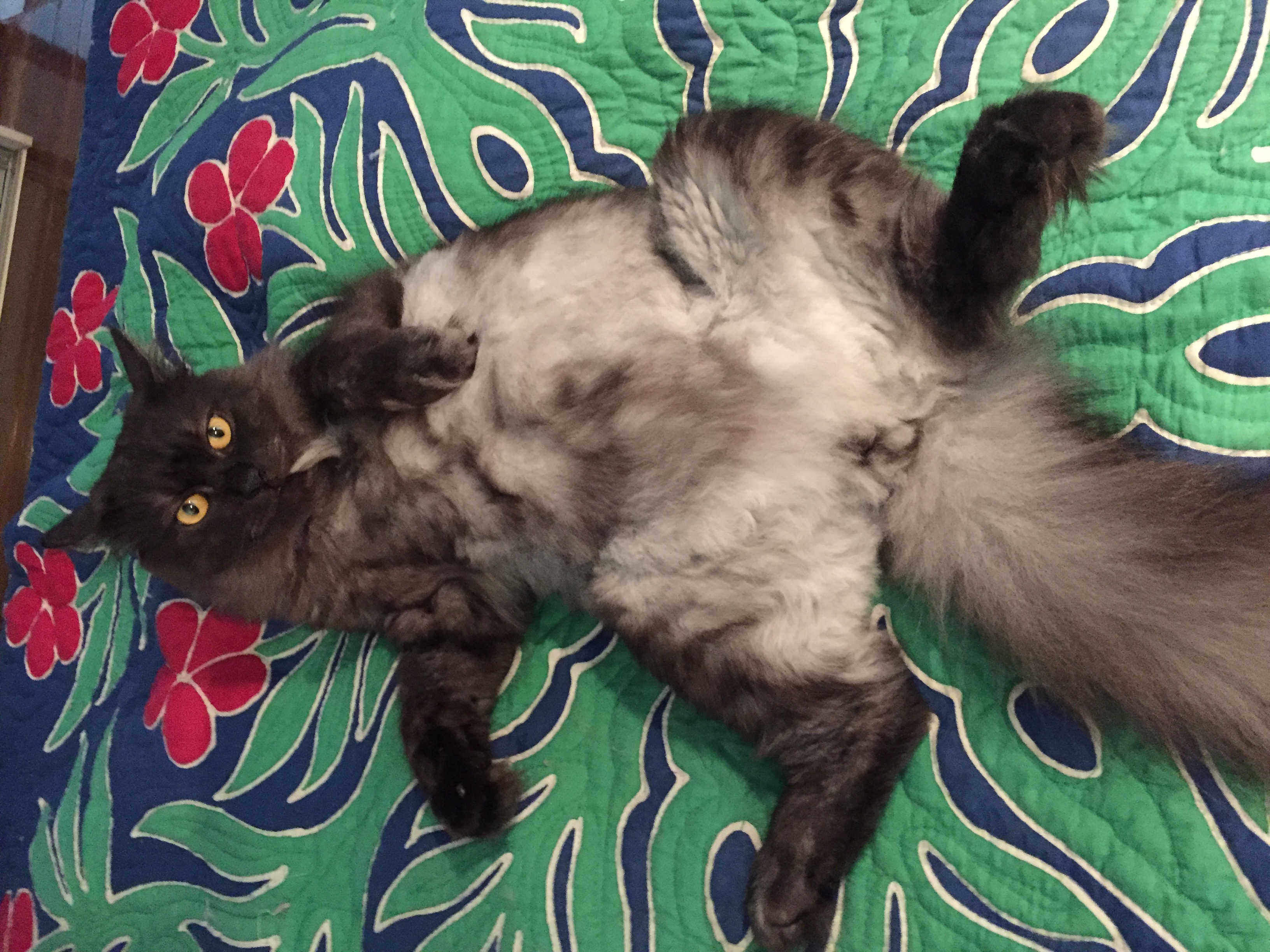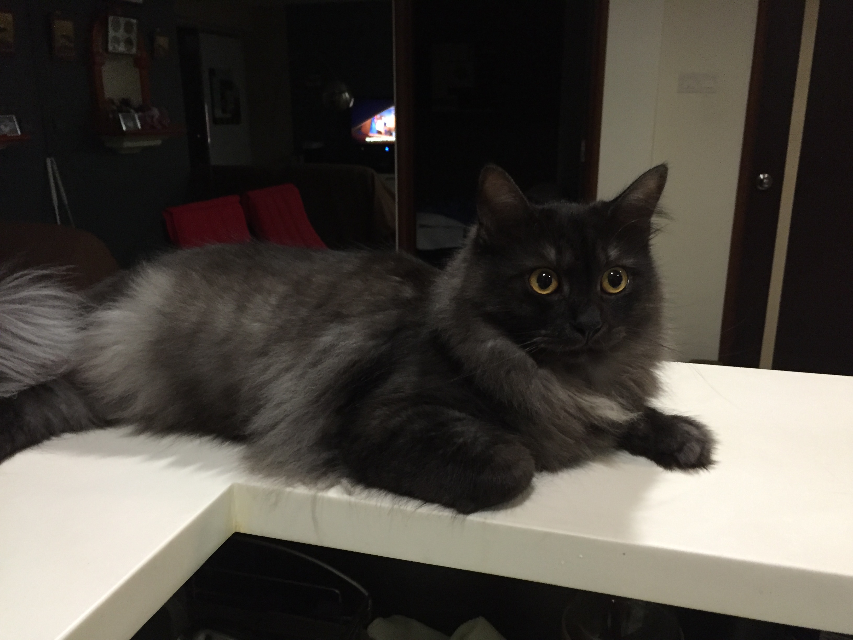 ピューマは長毛種のペルシャ猫なので、お腹側の毛が特に長い。だから、マレーシアの室内では暑いのだろう。普段は、リビングの床かカウンターキッチンの上で、お腹を付けて寝ているか寛いでいる。その部屋の中で一番涼しい場所を知っているのだ、猫は。