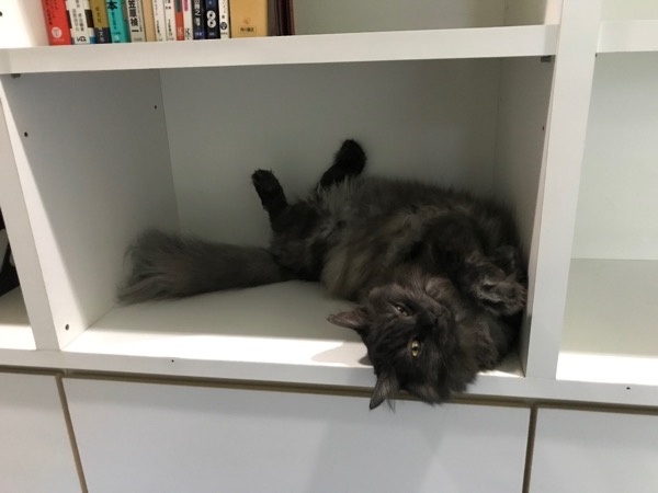 ピューマは、私の書斎の棚の中。猫は狭い所に隠れるのが好きなので、ちょうどいいサイズみたいだ。
