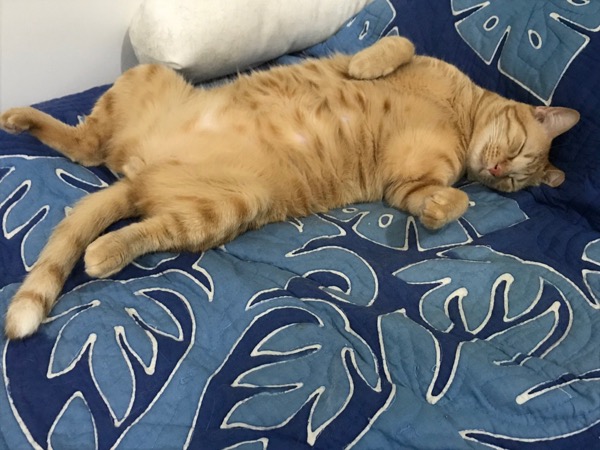 タイガの毛質は他の2匹とは変わっていて、長くも短くもなくその代わり柔らかい。そして、よく抜けて、他の布の表面にこびり付く。だから、このベッドカバーの表面は、いつも毛だらけだ。ここは書斎なので、デスクワークに疲れた時や読書の時、寝っ転がりたいのだ。そのため、2日に一回くらいは抜け毛掃除をしないとならない。