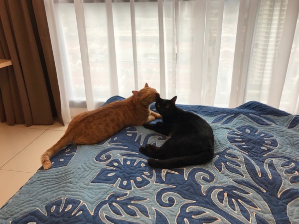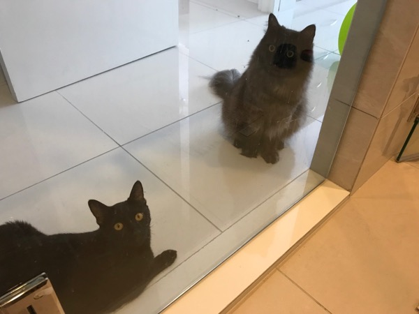 今回引っ越したコンドは、メインベッドルームの中にシャワールームがあるレイアウトで、その仕切りが透明のガラスドアになっている。すると何が困るって、シャワーやトイレに行く度に、猫たちが外で待っていることだ。