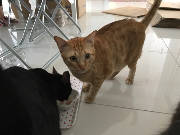 我が家のタイガは、気は優しくて力持ちな猫だ。この写真は、自分が食べていた皿をミミちゃんに取られてしまい、呆然とするタイガの図。