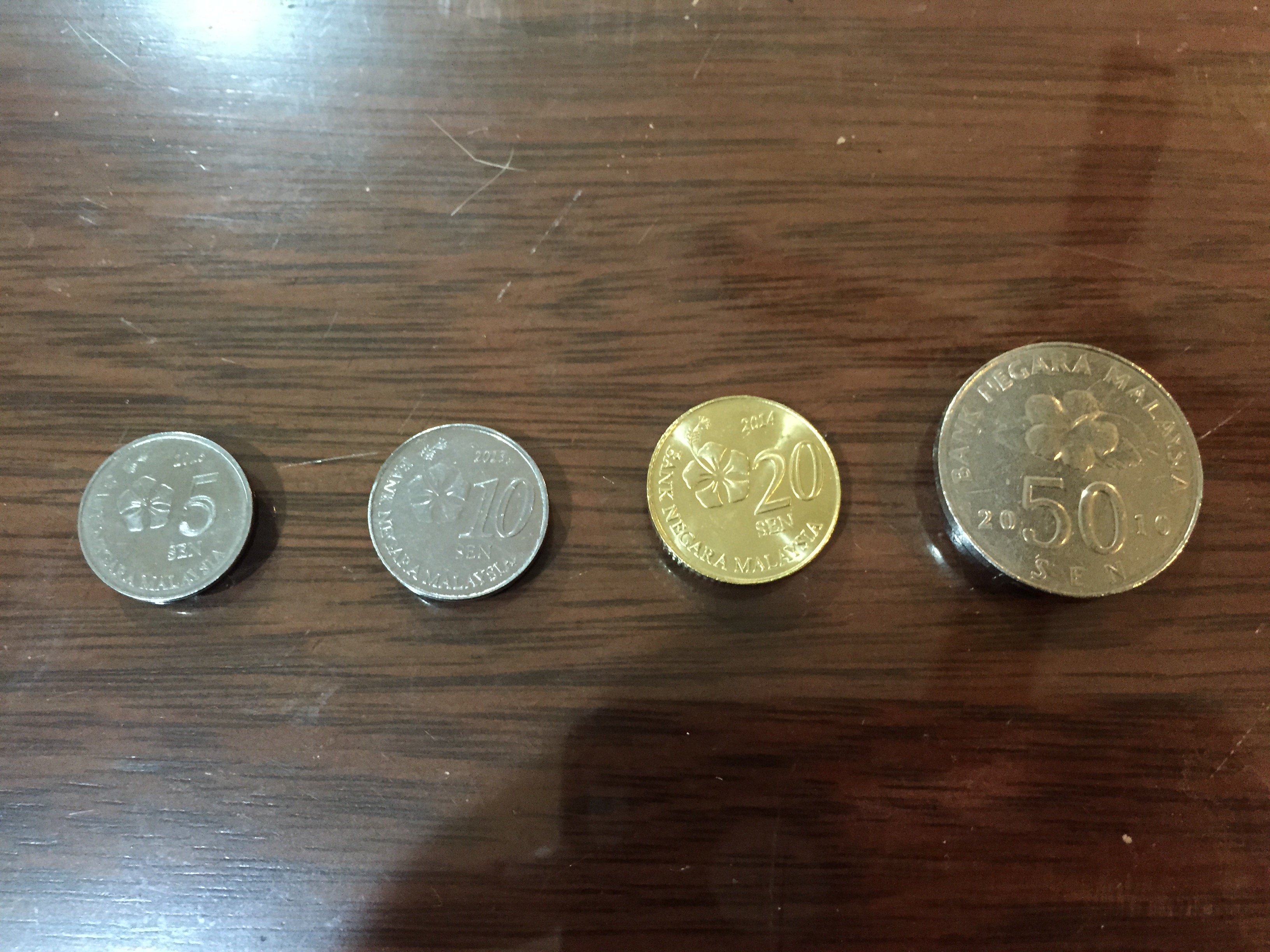 マレーシアのコインは現在、4種類ある。右から大きい順に50セン、20セン、10セン、5セン。1リンギット=100センなので、日本円に換算するとそれぞれ、15円、6円、3円、1.5円くらいの価値に相当する。