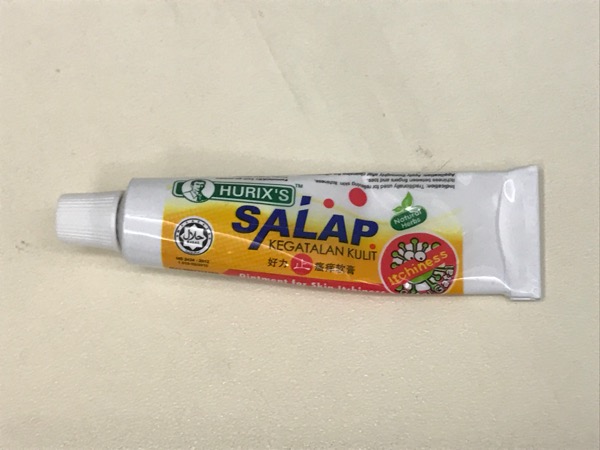 先日買ったこれはいいかもしれない。Hurix's Salap Kegatalan Kulit。12gで、確か15RMくらいだったか。即効性はそれほどないが、塗ってしばらくするとかゆみが徐々に収まってくる感じ。結構、よさそうだ。