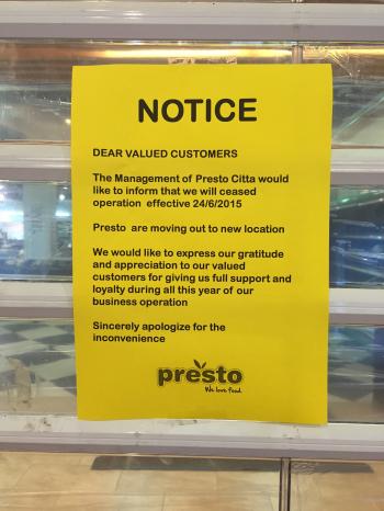 チッタモールのPrestoが、営業を停止した。先日、チッタモールに行くと、こんな張り紙がしてあった。どうやら、他の場所に移転するらしい。棚の商品が急に少なくなって何か変だなとは思っていたが、何の予告もなかったのでビックリだ。