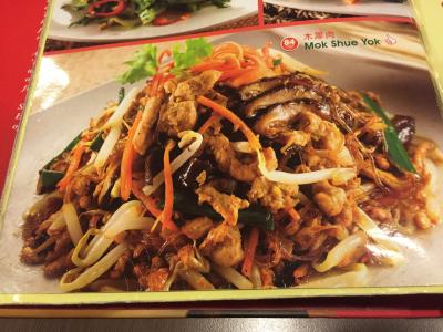 キクラゲやしいたけ、にんじん、もやし、ねぎ、豚肉などが春雨とともに炒めてあり、蒸した餃子の皮に包んで食べる。そう、北京ダックのあの食べ方だ。食べ方としては新しくはないが、小麦粉でできた皮に包んで食べると、一層おいしくなることを発見した。