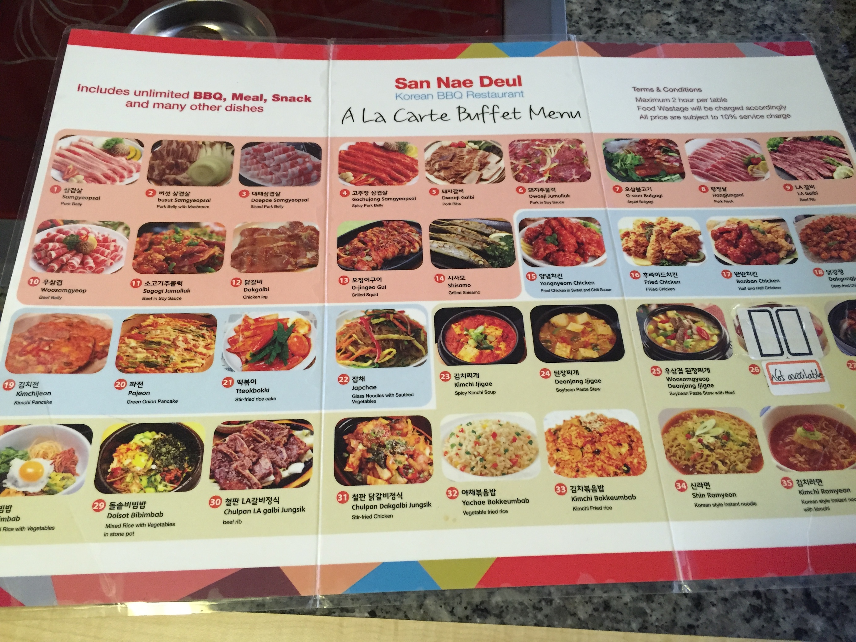 ビュッフェは、写真のメニューからどれでも注文できる。豚バラからブルコギまで豊富な焼き肉に加え、スンドゥブチゲや石焼ビビンバなど、定番メニューもある。最初は、1品当たりの量が少なくてショボいと感じたものだが、逆に色々食べられていいのではと思い直した。それが気に入れば、またオーダーすればいい訳だし。もちろん、韓国料理店では定番の野菜小皿も付いてくる。