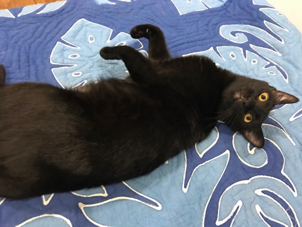しばらくお腹の上にいて、飽きると降りて行く。ポーズもその時によって違って、こちら向きになったり、お尻を向けたり、横になったり、と。