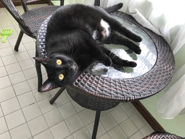 ミミちゃんは、寝室のベッドとサンルームのテーブルの上だ。特に、ここでお腹を撫でられるのが好きなのだ。