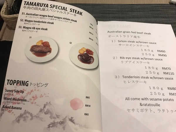 注文したのは、オーストラリア牛のサーロイン180gと和風ハンバーグステーキ(オーストラリア牛)180g。60と38リンギ(GST除く)だった。